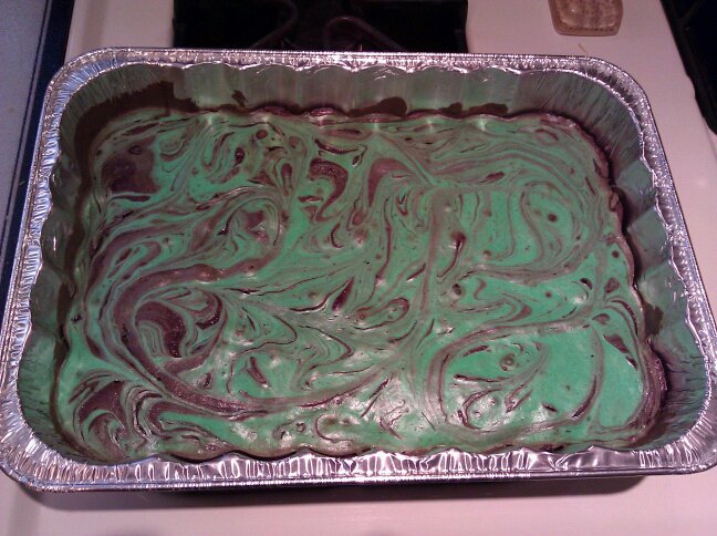 An example of green cheesecake brownies I made for a Jets-themed party. All it took was a few drops of green food coloring in the cheesecake mixture.