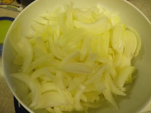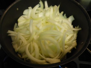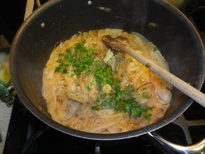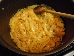 Melt about a stick of butter in a large stock pot, preferably one with a heavy bottom. Add the onions and cook over medium heat, stirring occasionally.