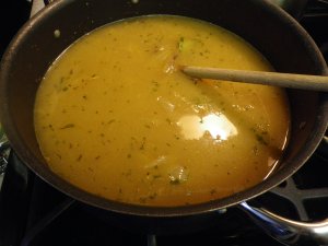 Add about two quarts of beef stock, and allow to simmer for an least an hour. Soup can be served immediately, or cooled to be reheated and served later.