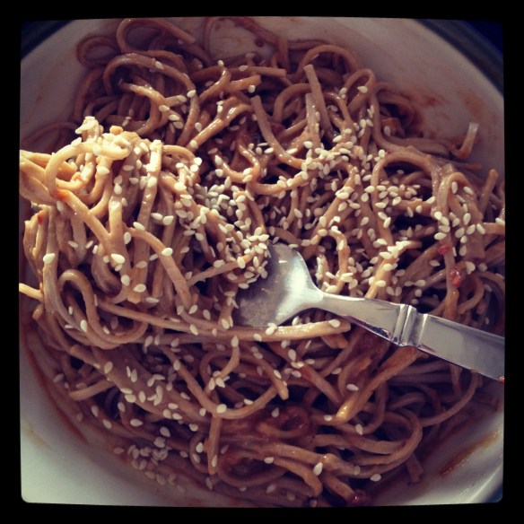 - Mix peanut sauce with warm noodles, top with sesame seeds