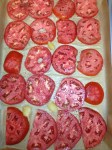 2. Slice tomatoes, sprinkle with salt and pepper and arrange in a single layer on a baking sheet (more than one baking sheet may be necessary). Arrange the cloves of garlic on the baking sheet as well. Spray both sides of the tomatoes with cooking spray. Bake for about 1/2 an hour – tomatoes should be soft and falling apart, but not dry.
