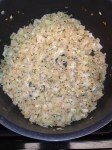 4. In a large stock pot, coat the bottom with olive oil, about 1/4 to 1/3 a cup. Heat the oil for about a minute and add the onions. Cook for about 1 minute and add Italian seasoning, crushed red pepper, and nutmeg. Continue to cook the onions until soft and slightly translucent, about five minutes.