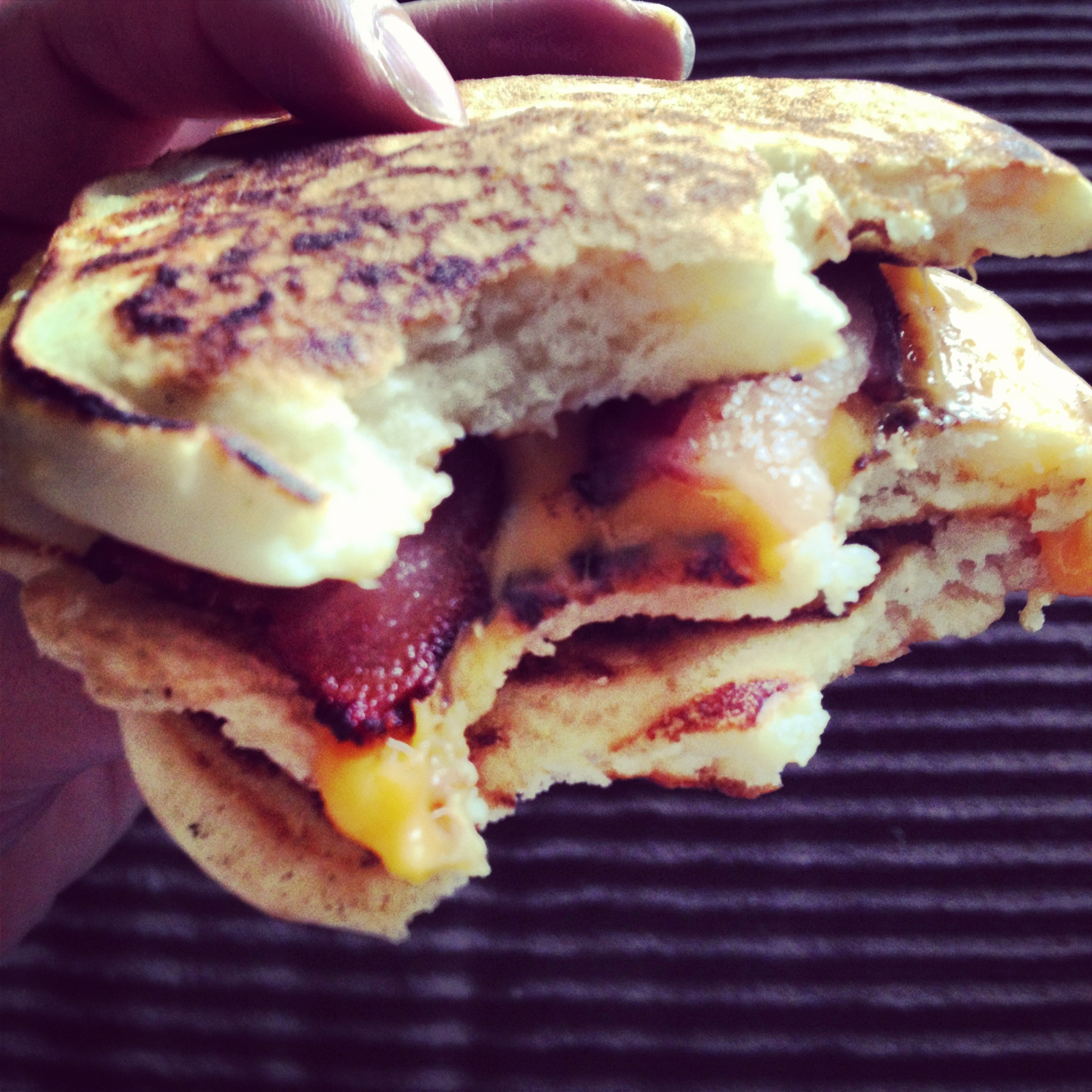 This is a pretty simple and quick breakfast that you may make as little or as much of as you like. In this case, I used about 1/2 cup of pancake batter (from an add-water mix), two slices American cheese, and 2 slices bacon. I first cooked the bacon and reserved a little grease. I divided the batter for form three pancakes. Upon flipping over the pancakes, I added cheese to two cakes. Finally, I stacked up the pancakes with a slice of bacon between each stack (cut in half so it would cover the full pancake. A little messy for cooking, but damn tasty!