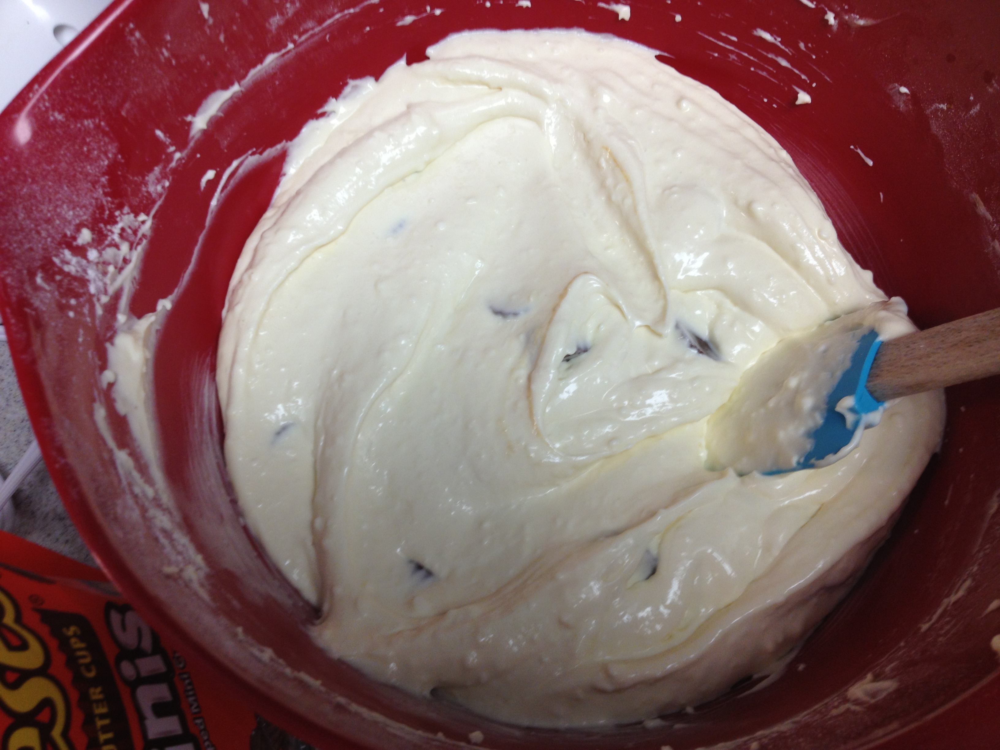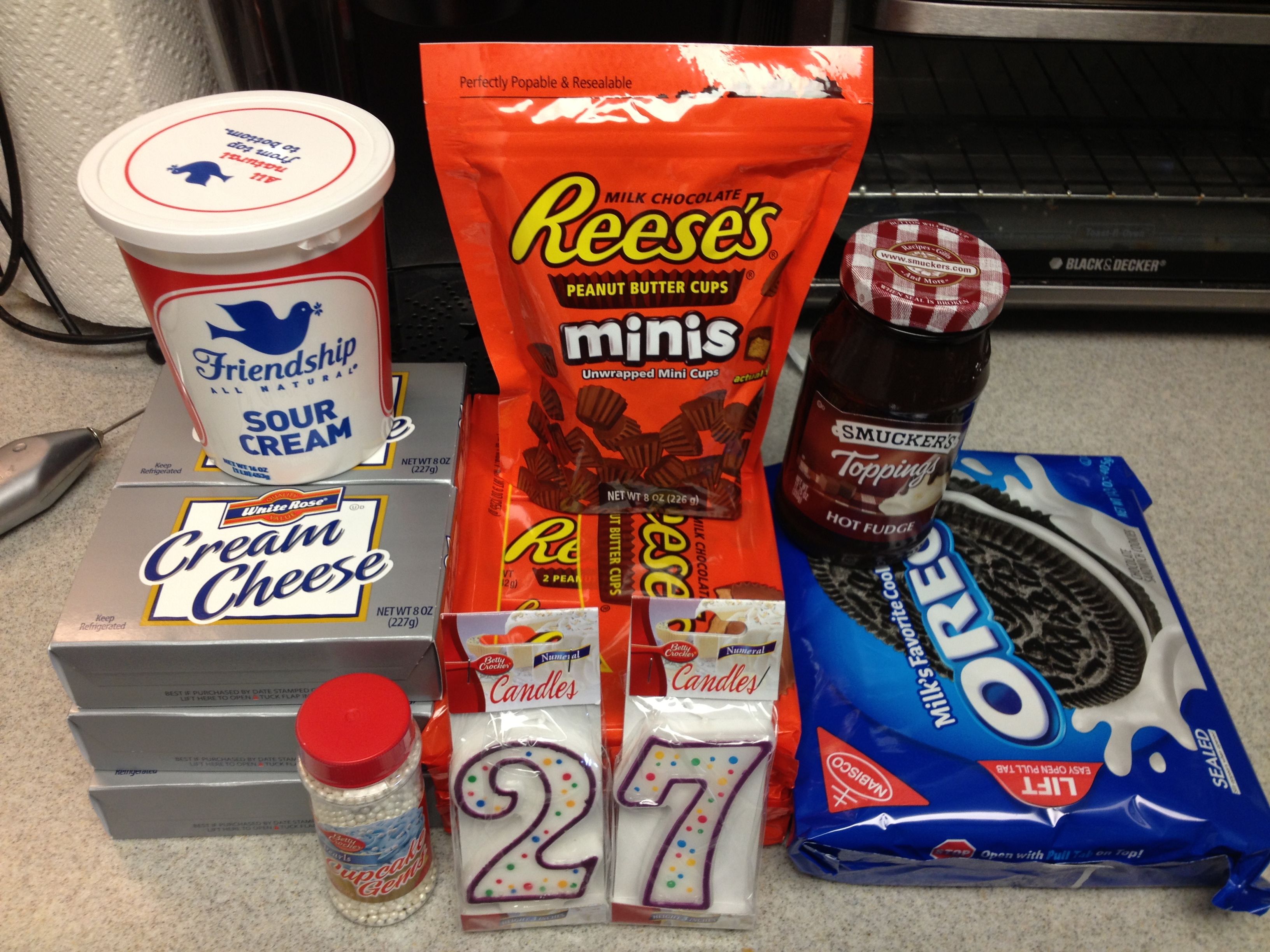 In recent months, I have become a fan of the mini peanut butter cups, the ones that are a bit larger in size than an M&M. It came to me that it would be fun to fold those into cheesecake, almost like chocolate chips, and in lieu of chopping up full sized peanut butter cups. So finally I had the cake narrowed down – vanilla flavored cheesecake with an Oreo crust, mini Reese’s mixed in, the top decorated with hot fudge and full sized peanut butter cups. Since, you know, nothing says love as much as making the most fattening cake imaginable.