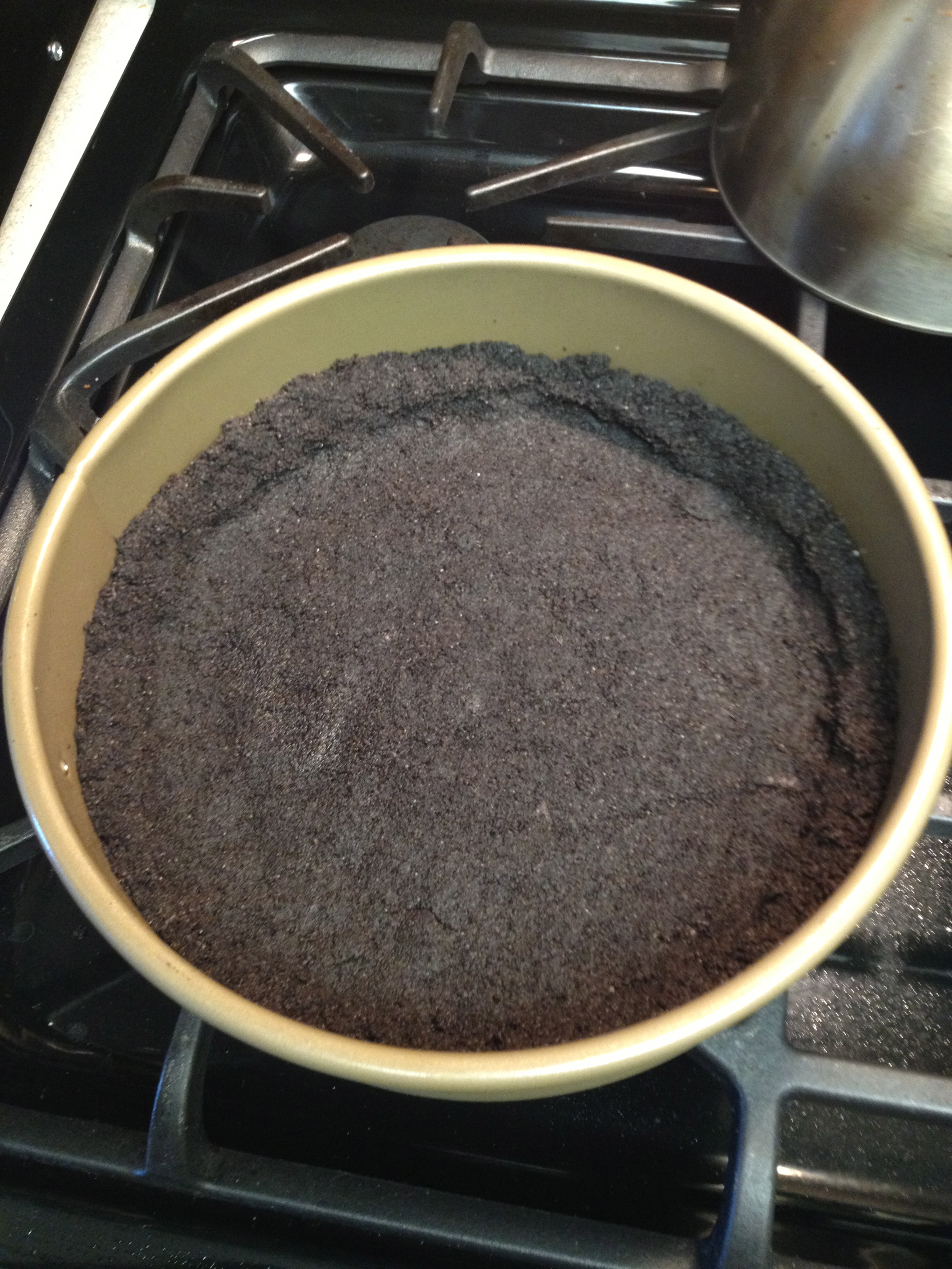 - Combine crushed Oreos, melted butter and sugar until well blended. Press mixture evenly into pan, both on bottom and about halfway up the sides of the pan. Bake about 10 minutes. Remove and cool. Lower oven temp to 325 degrees.
