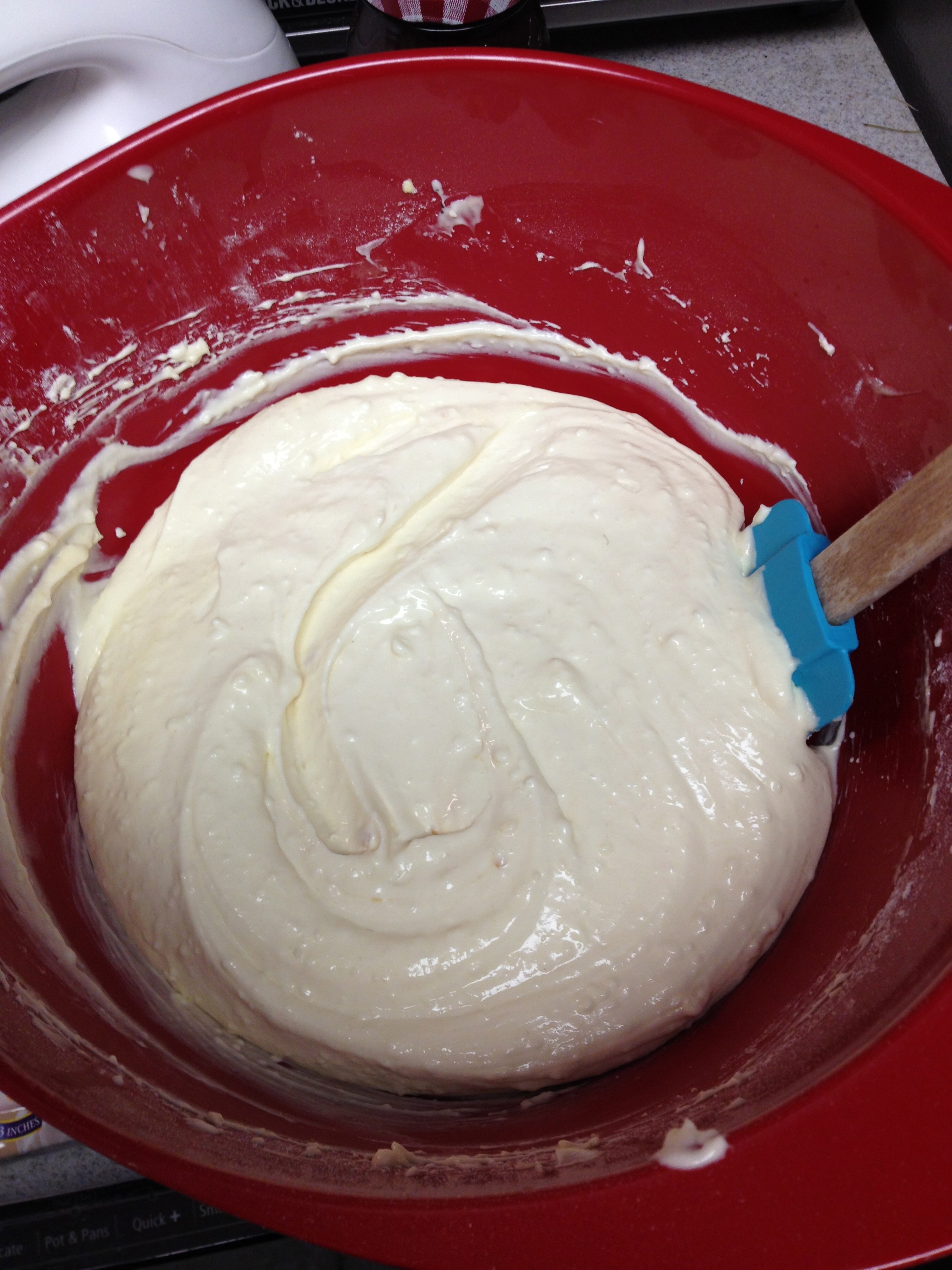 - Meanwhile, using a hand mixer, mix cream cheese and sugar until well incorporated. Add eggs and mix in thoroughly. Then blend in sour cream and vanilla.
