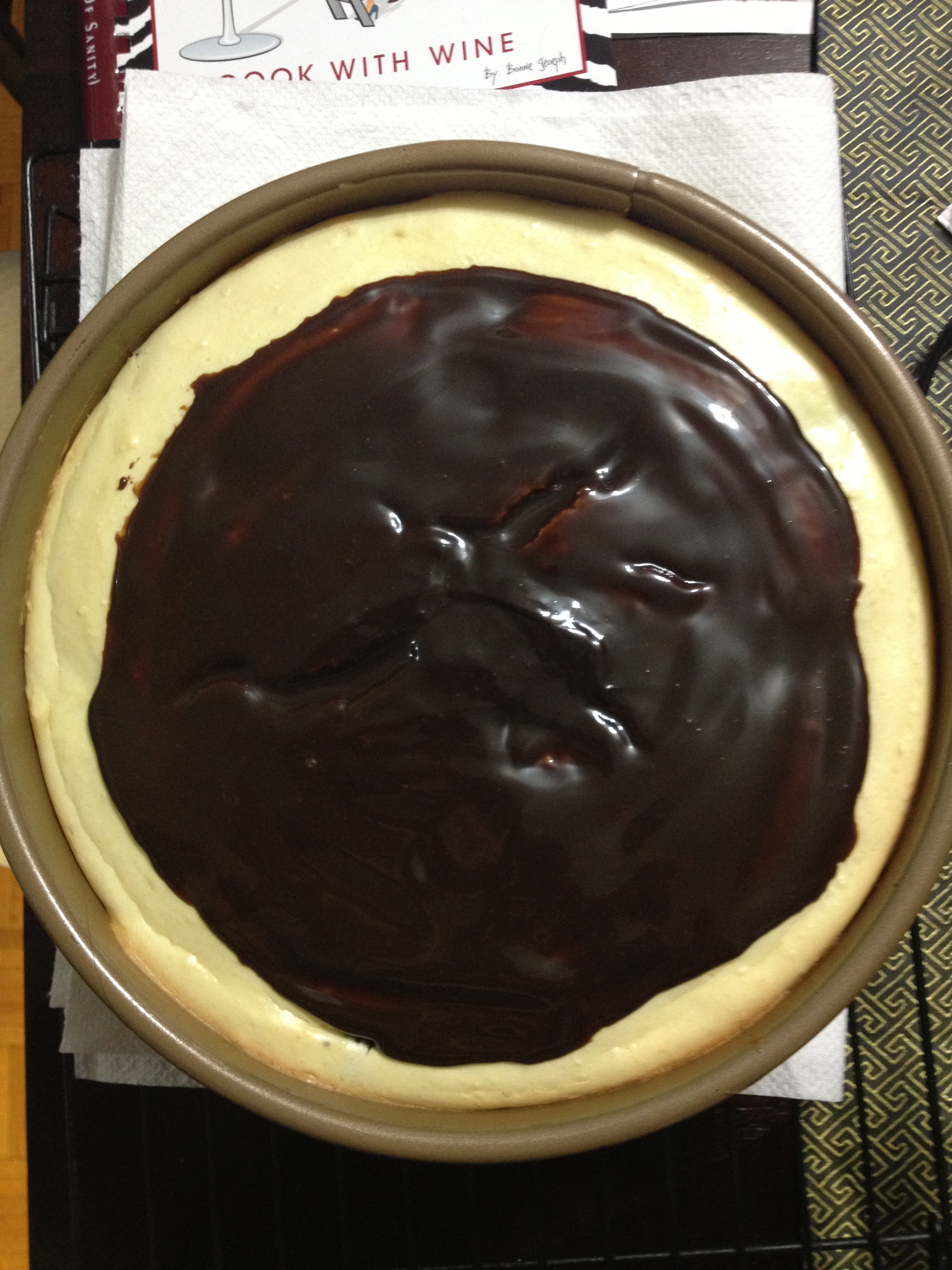 - Remove cheesecake from oven and allow to cool at room temperature for one hour. At this time, you can evenly spread the fudge in the center to decorate. After the hour, place the cheesecake in the refrigerator and chill for a minimum of three hours, up to overnight.