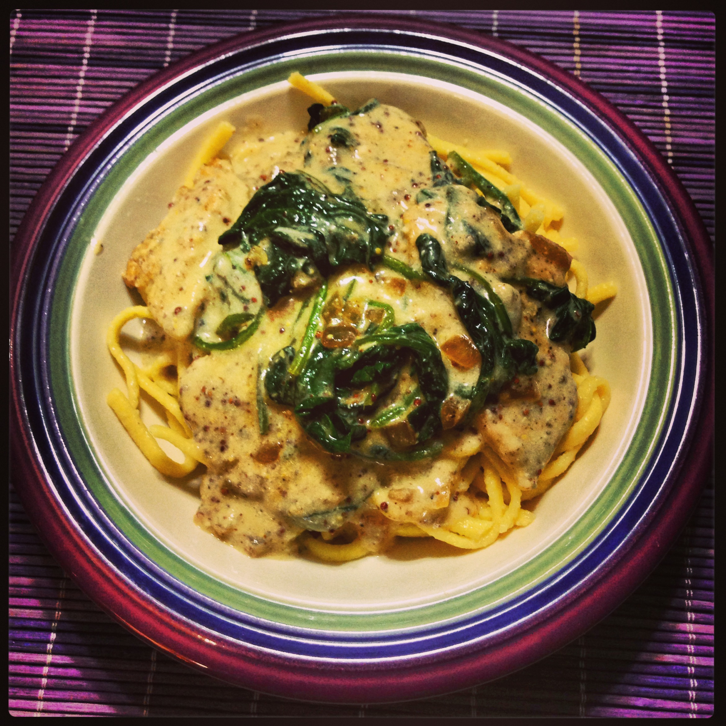 The dish is made in three parts, utilizing a large saute pan in all three steps – chicken, then spinach, then sauce. Serve over egg noodles or your favorite pasta.