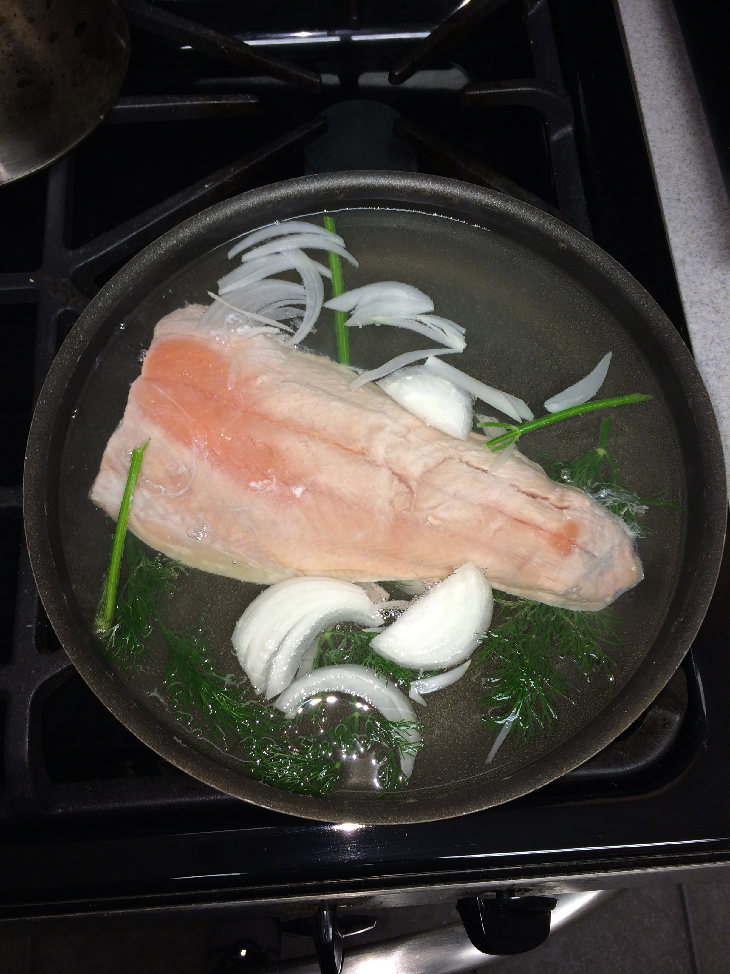 To poach I used some water, dry white wine (Pinot Grigio), dill, and onion. I brought the liquid to a low boil and then reduced to barely a simmer and then added the fish filet, whole. I poached the fish about 10 minutes, to the point it was opaque but had a little give.