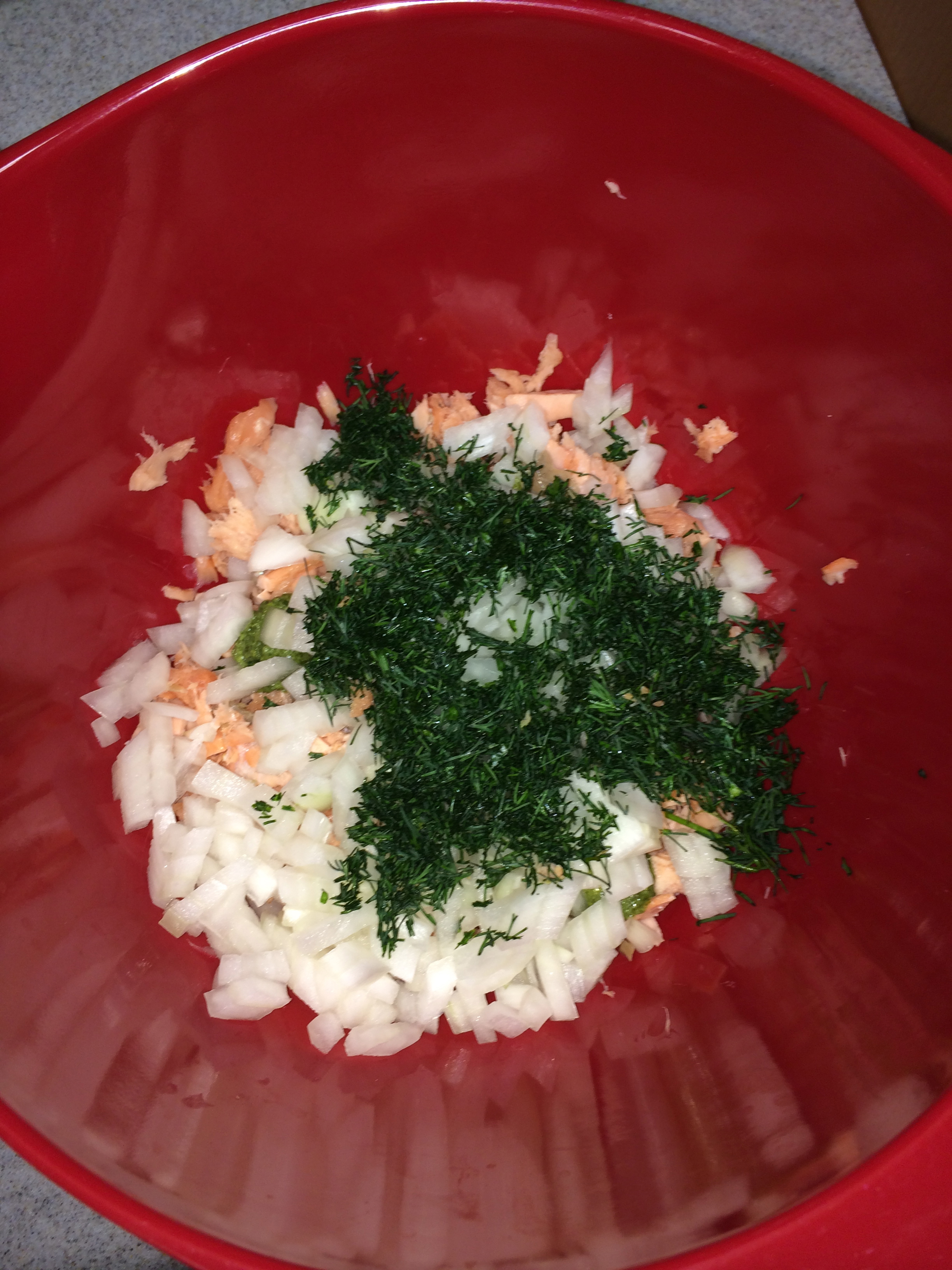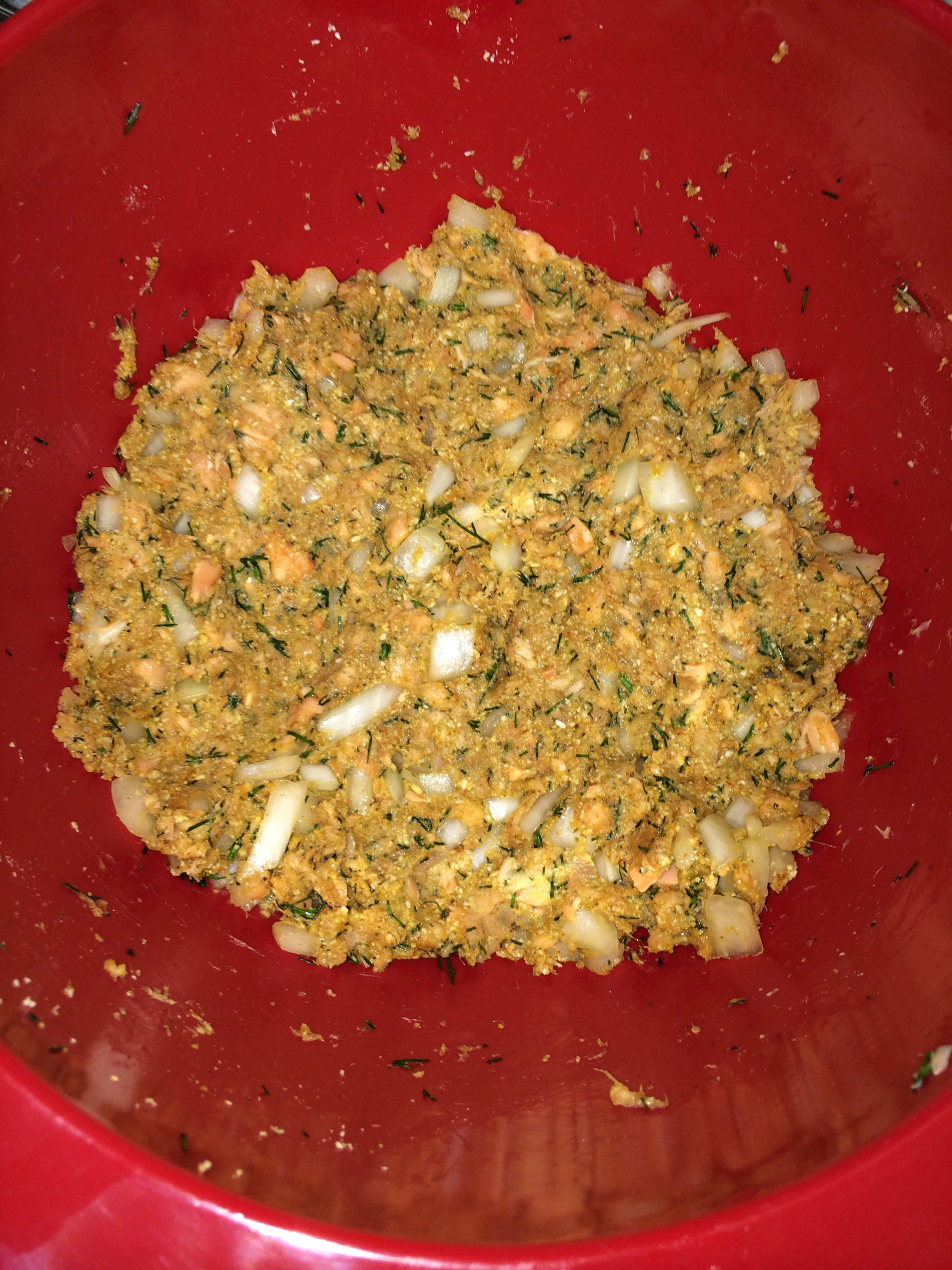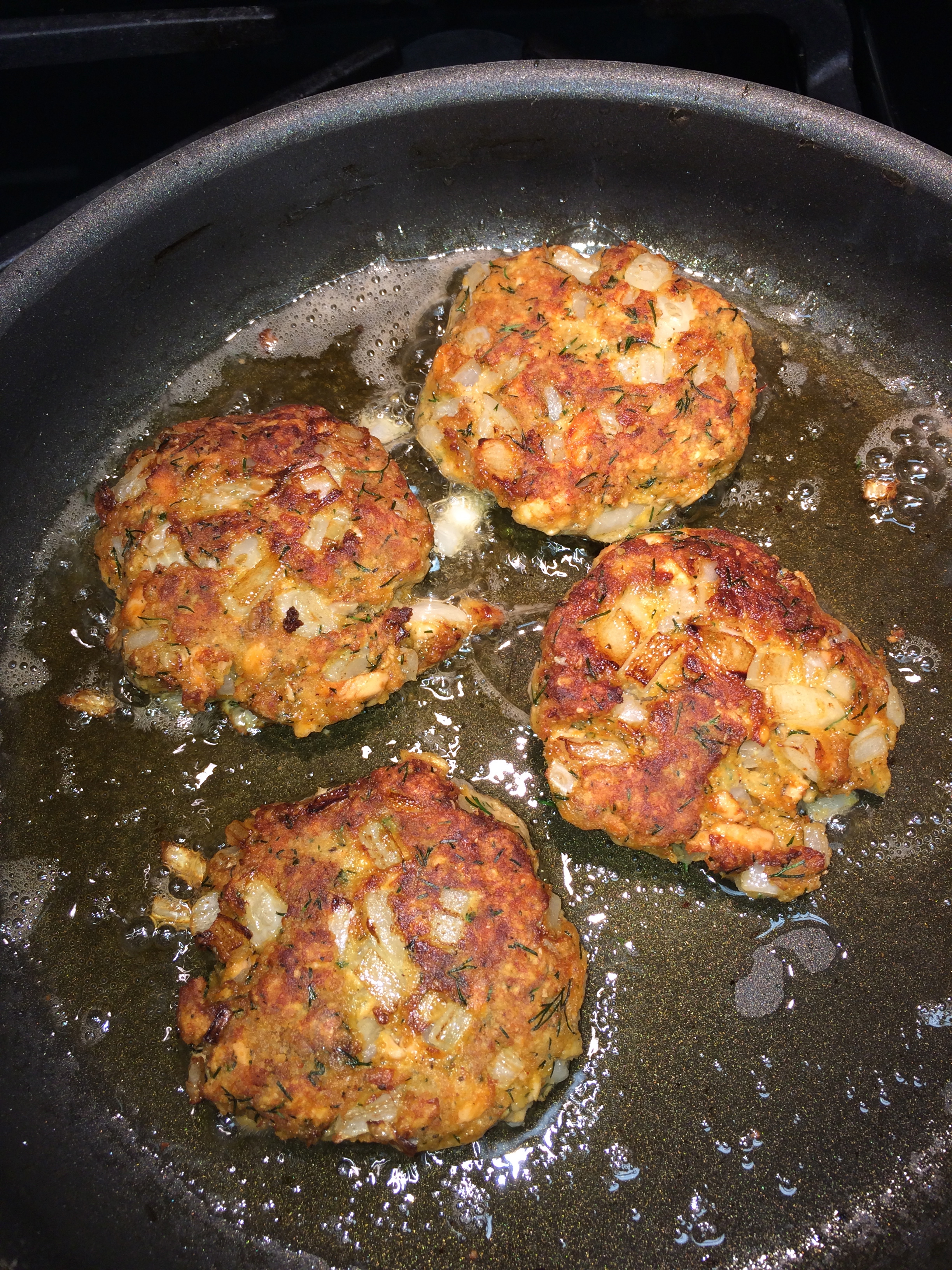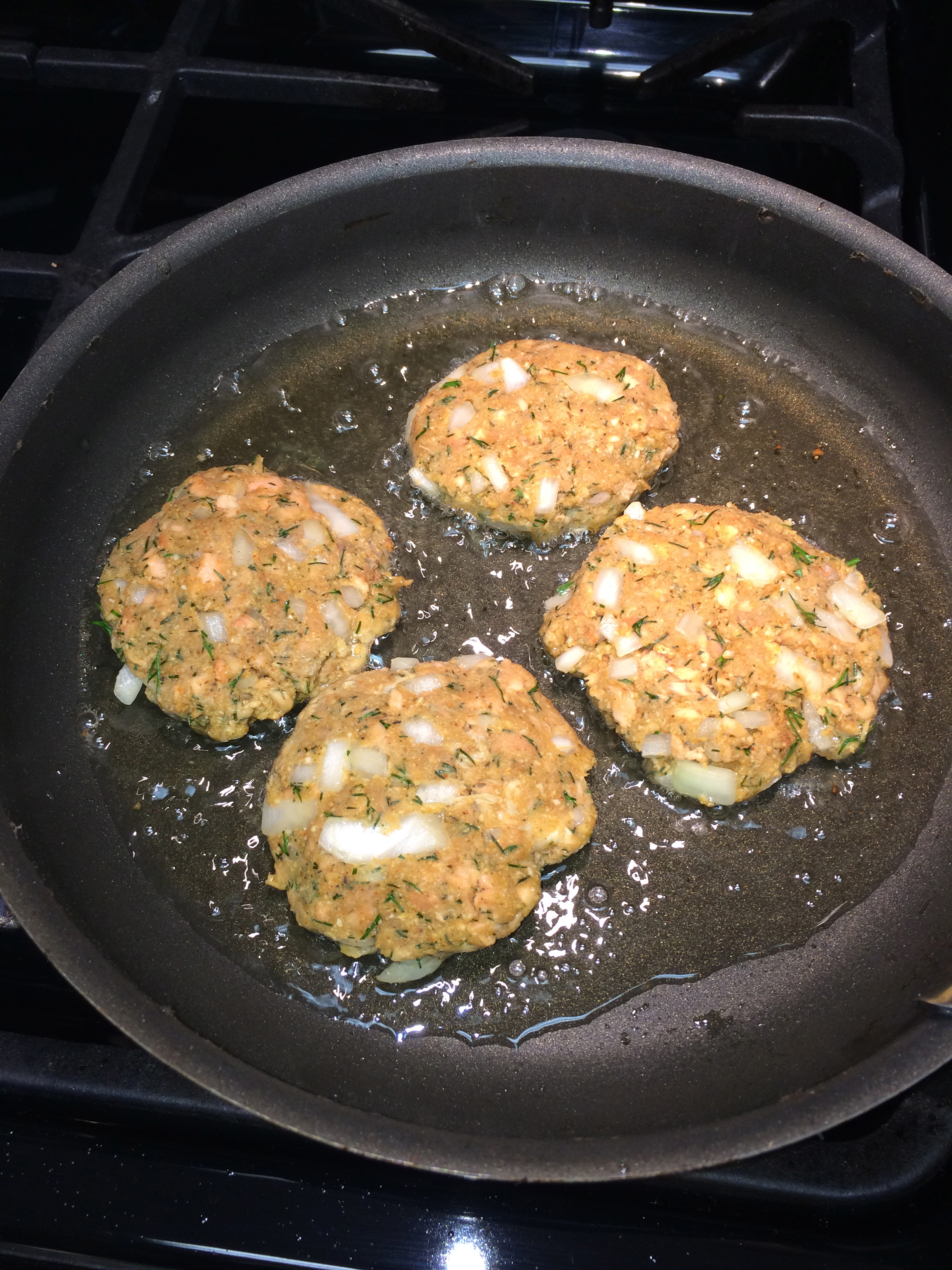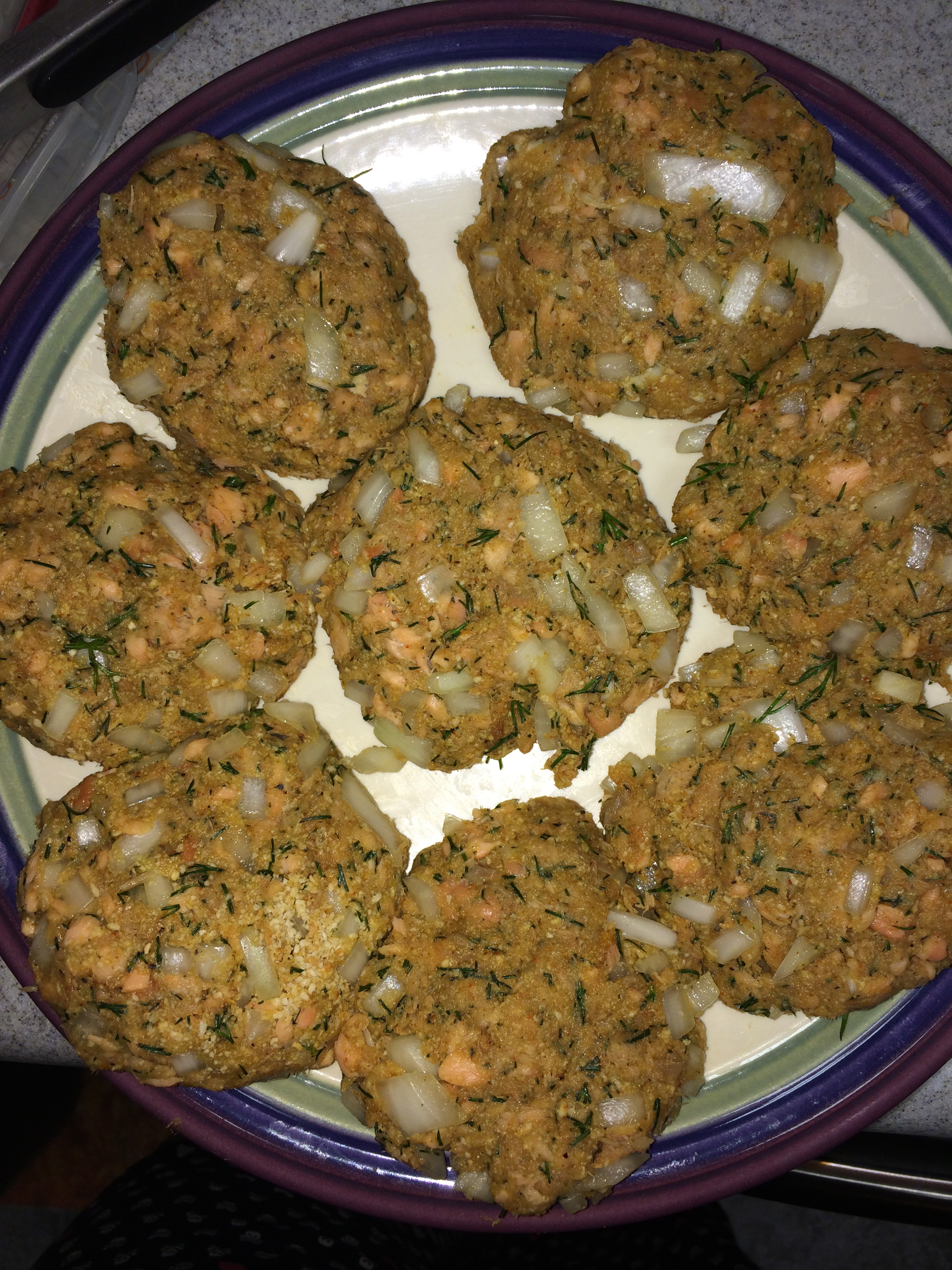 I thought of all the ways I enjoy salmon, such as smoked, sushi, broiled, etc., but half those options I cannot feasibly do at home safely or affordably. I started tinkering around some websites and saw a photo of salmon cakes. Duh! Why didn’t I think of that sooner? I played around with ingredients in my fridge and pantry and came up with this recipe.
