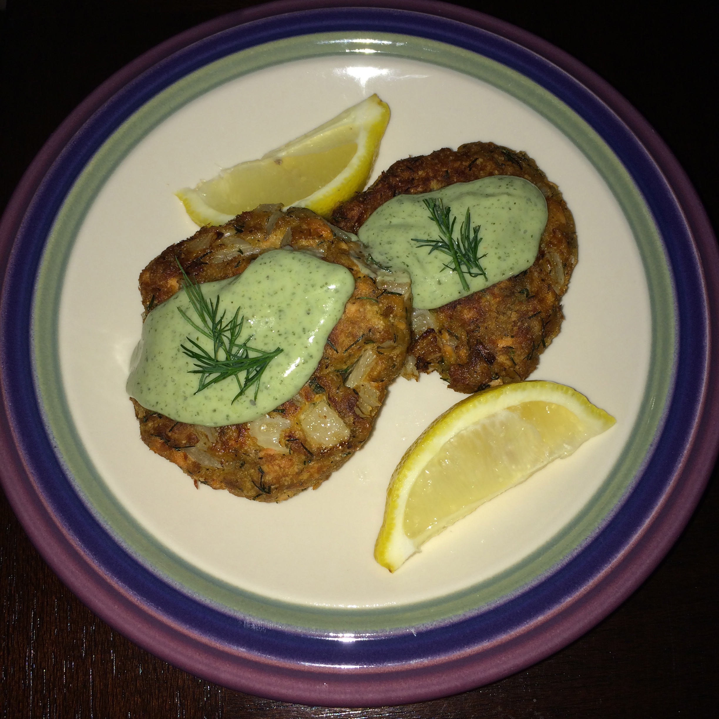 - Serve cakes with the Lemon-Chimichurri Aoli and garnish with lemon wedges and fresh dill. Salmon Cakes can be enjoyed hot or at room temperature.