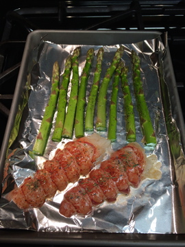 - Line a baking sheet with foil. Mix 1 tablespoon olive oil with the asparagus, sprinkle with salt and pepper – rub the spears with the seasoning to fully incorporate. Line up spears on half of the baking sheet.