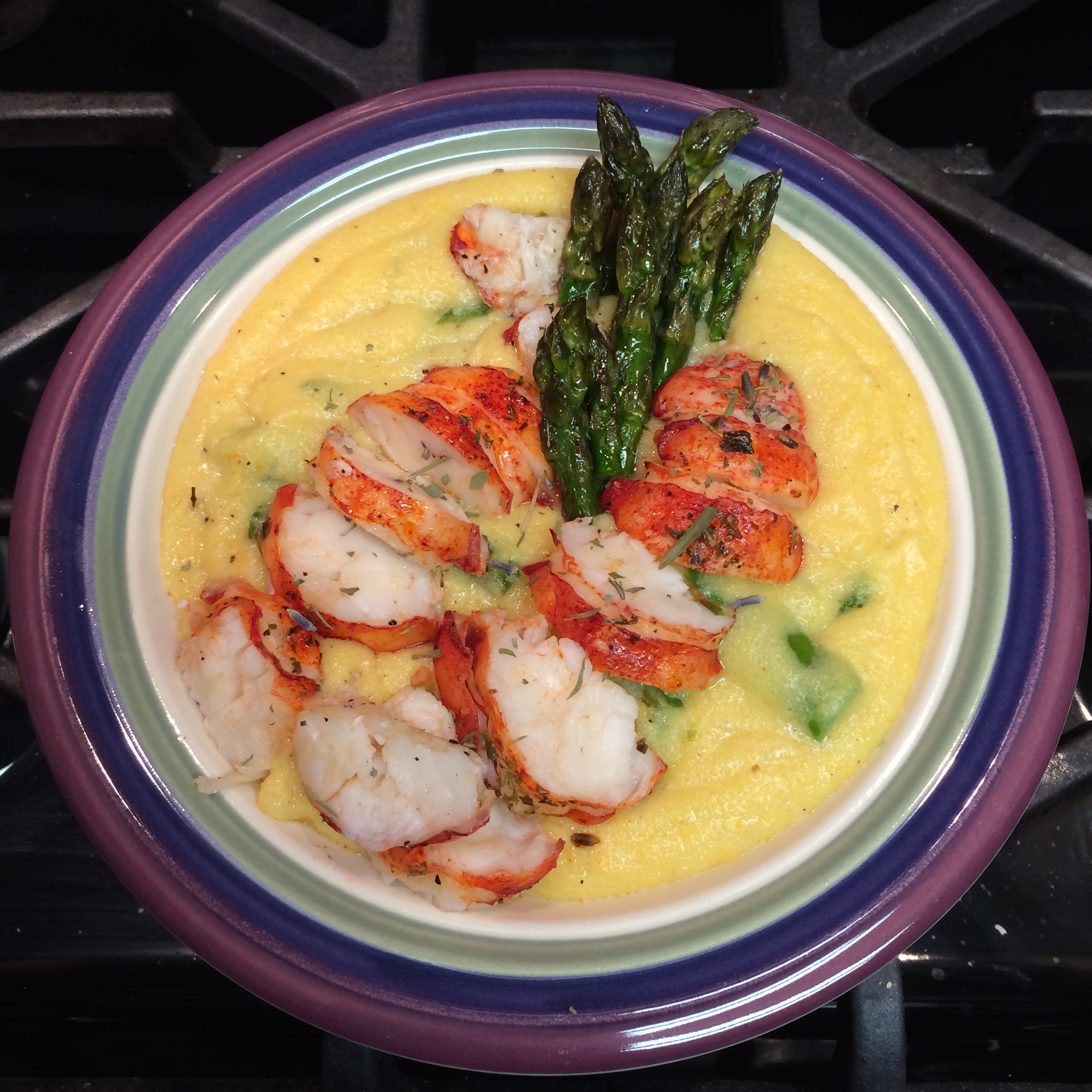 - This dish is best served immediately. To serve – cut the asparagus into 1-2″ pieces, reserving the tops of the spears for garnish. Mix the remainder into the polenta and pour into a shallow bowl. Slice the lobster meat into 1/2 slices and shingle the meat over the polenta – garnish with the spears.