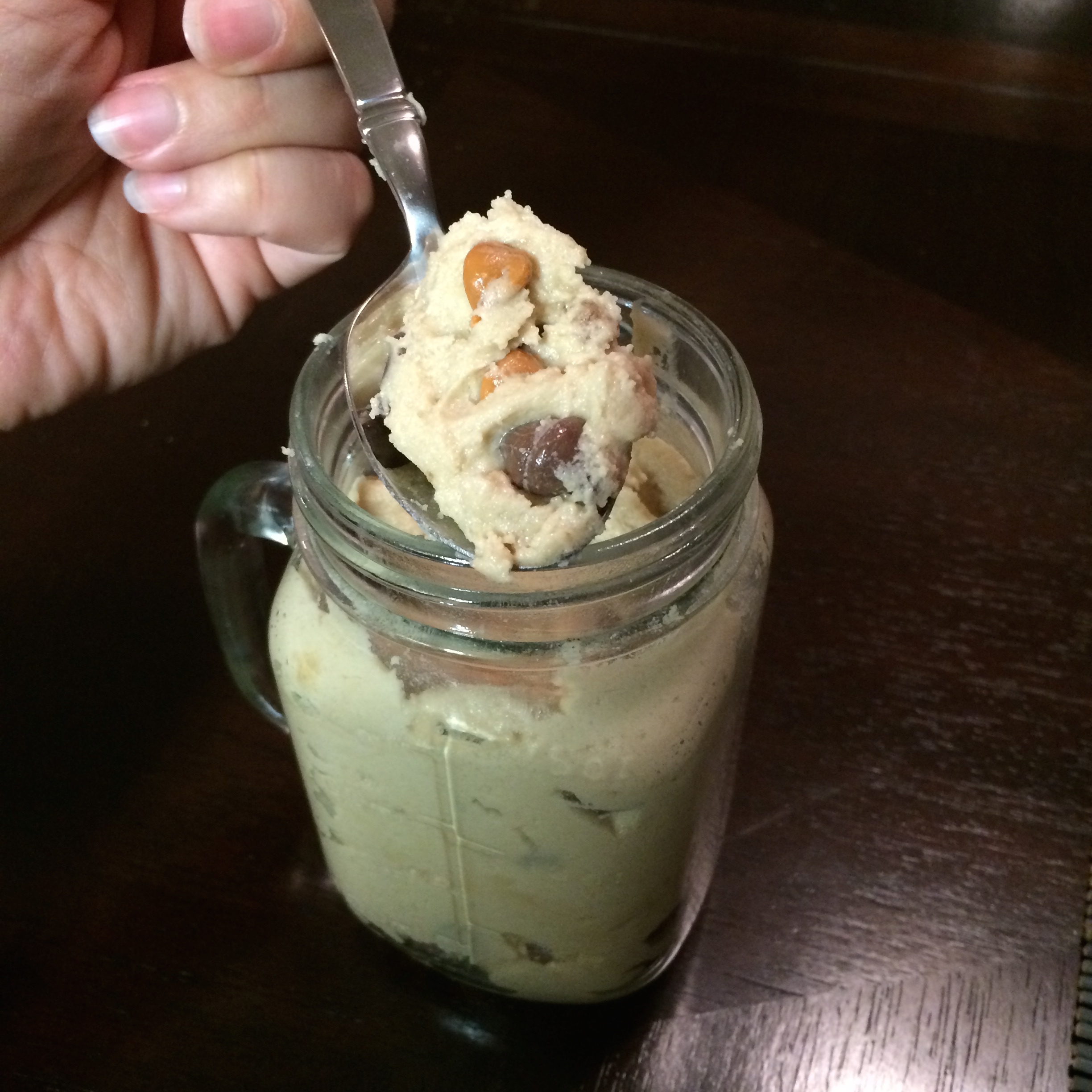 Actually, in case of PMS, break open glass. Now sometimes we women have cravings. Tonight I was in the mood for cookie dough. Luckily, thanks to my Accidental Pantry Project, I knew I had all the ingredients, and this snack took little more effort than me running to the store for ready made dough. Plus, even though it’s not a low-cal snack, by making it myself I know exactly what is in it. And anything in a mason jar is just fun. (Thanks, Pinterest.)