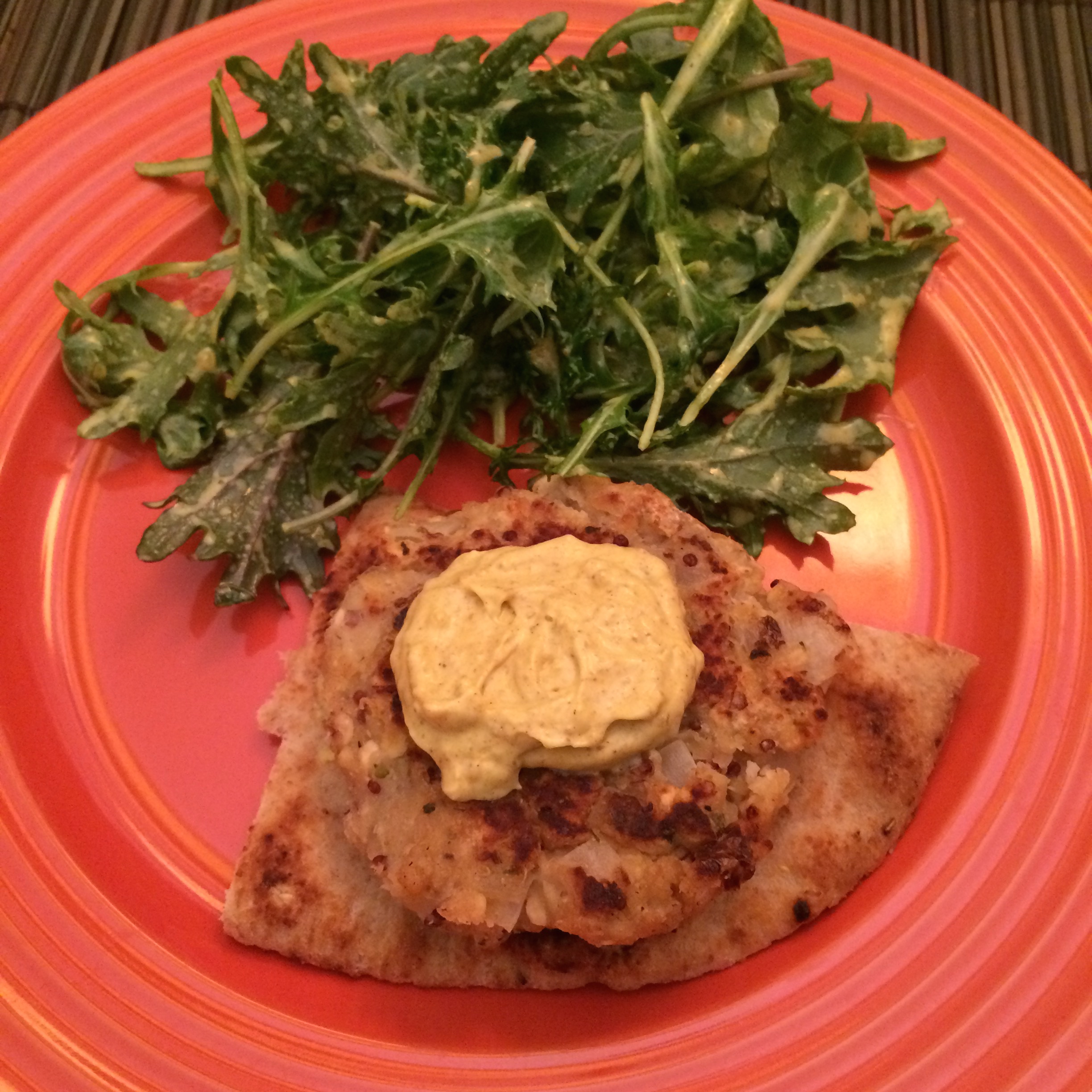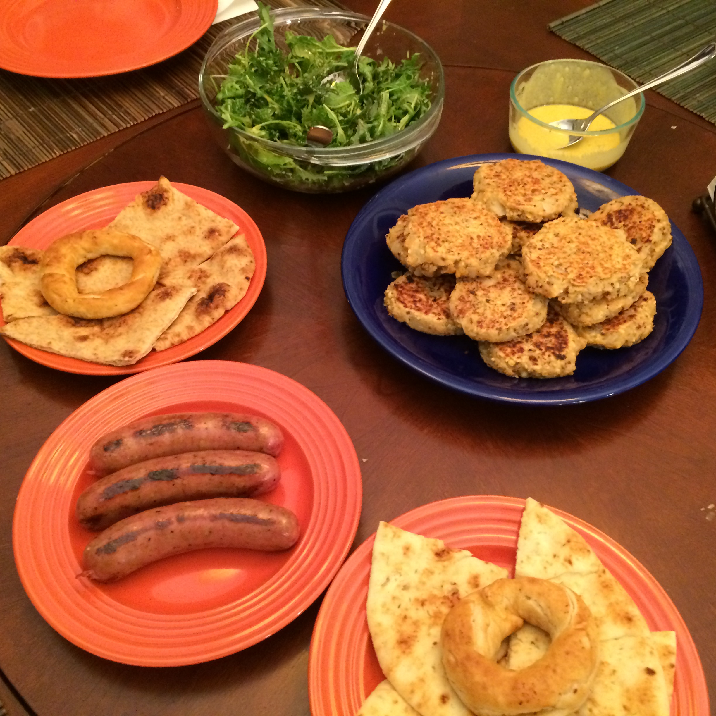 The Meal – Lentil Cakes, Curry Aioli, Mixed Green Salad with Curry Dressing, Two Types of Naan (whole wheat and garlic), Apple Chicken Sausage, and a couple of leftover Pretzels