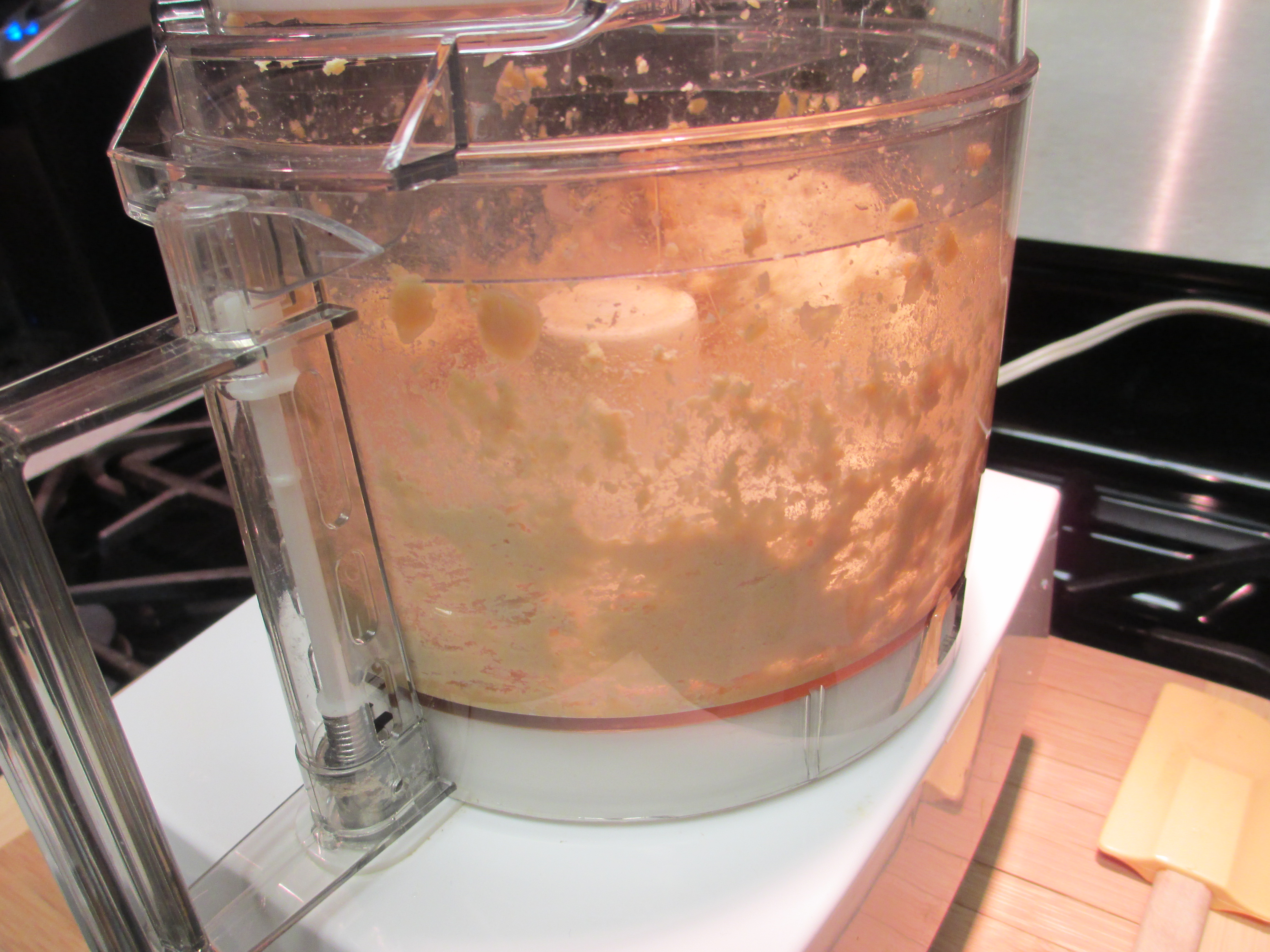 IMG_0932 Published February 1, 2015 at 4608 × 3456 in Inventory, Part 4 – Freezer and Fridge Condiments Turn processor on. Drizzle in olive oil through shoot in cover, and process until well blended. Open lid, scrape excess off sides. Taste test and add salt and pepper as desired. For smoother hummus, drizzle in 1/4 – 1/2 cup water.