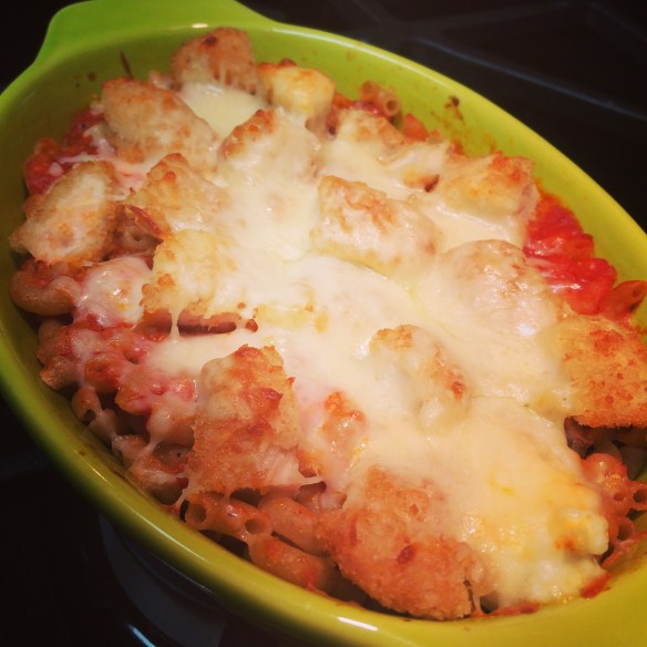 I baked two frozen chicken fingers while I boiled the pasta (I used half a cup of whole wheat elbow macaroni). When the pasta was done, I drained it and placed it into a small casserole dish. I mixed in about 1/2 cup Rao’s marinara sauce and a couple of dollops of part skim ricotta. I then took the chicken fingers out of the oven, diced them up, and covered with a bit more sauce and shredded Italian blend cheese. I then baked it in the oven about 10 minutes until the cheese melted.