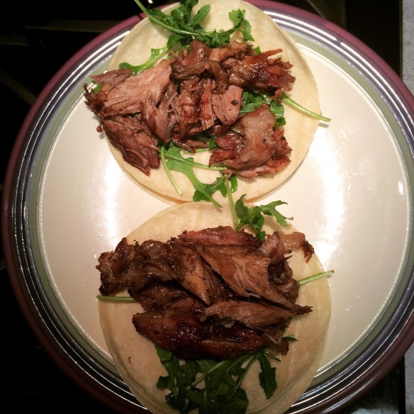 Meanwhile, I warmed corn tortillas with some cheddar Jack cheese in the middle. I then tossed some greens with a squeeze of lime (shamefully I picked the lime out of my sangria but it kind of worked!). Dinner, boom.