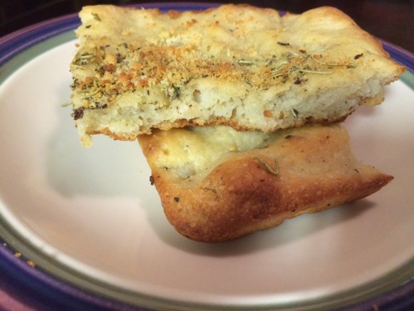 For a moister, fluffier center and chewy-crunch crust, potatoes are also used. My inspiration for this focaccia came from a Bon Appetit recipe from a few years ago. I modified it this time around, omitting the seasonings/toppings. I opted for a Rosemary-rich Italian seasoning blend and Parmesan cheese.