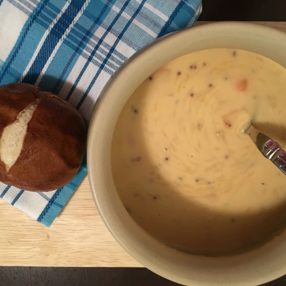 Beer and Cheese Soup with a Pretzel Bun