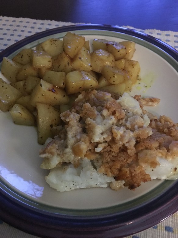 Carb overload. Cod with a lemon butter cracker crust and Greek lemon potatoes