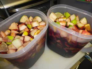 If you don’t have a large container, you can divide up the liquid into smaller pitchers for serving. It’s best to leave the fruit in overnight because it allows more flavors to develop, but if traveling to a party you can store the liquids in one container and fruit in another.